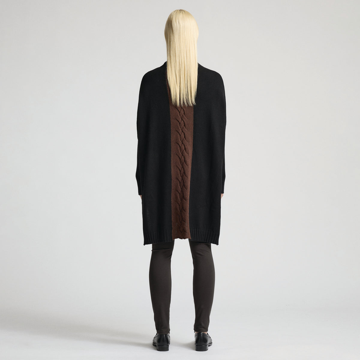 The mid-weight/thickness textured knit is loose, comfy and stylish. We all know the RAW by RAW wearer loves a cape or a shrug and Rory is precisely that! With the High/Low cut hem, mid-thigh length at the front and knee-length at the back, complemented by the signature RAW by RAW extended long rib cuffs. The Rory also has a contrast colour and yarn chunky cable knit back insert trim in the centre back.
