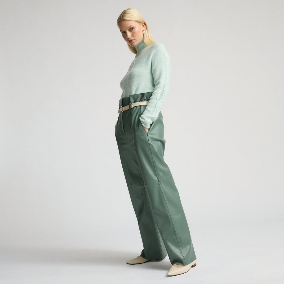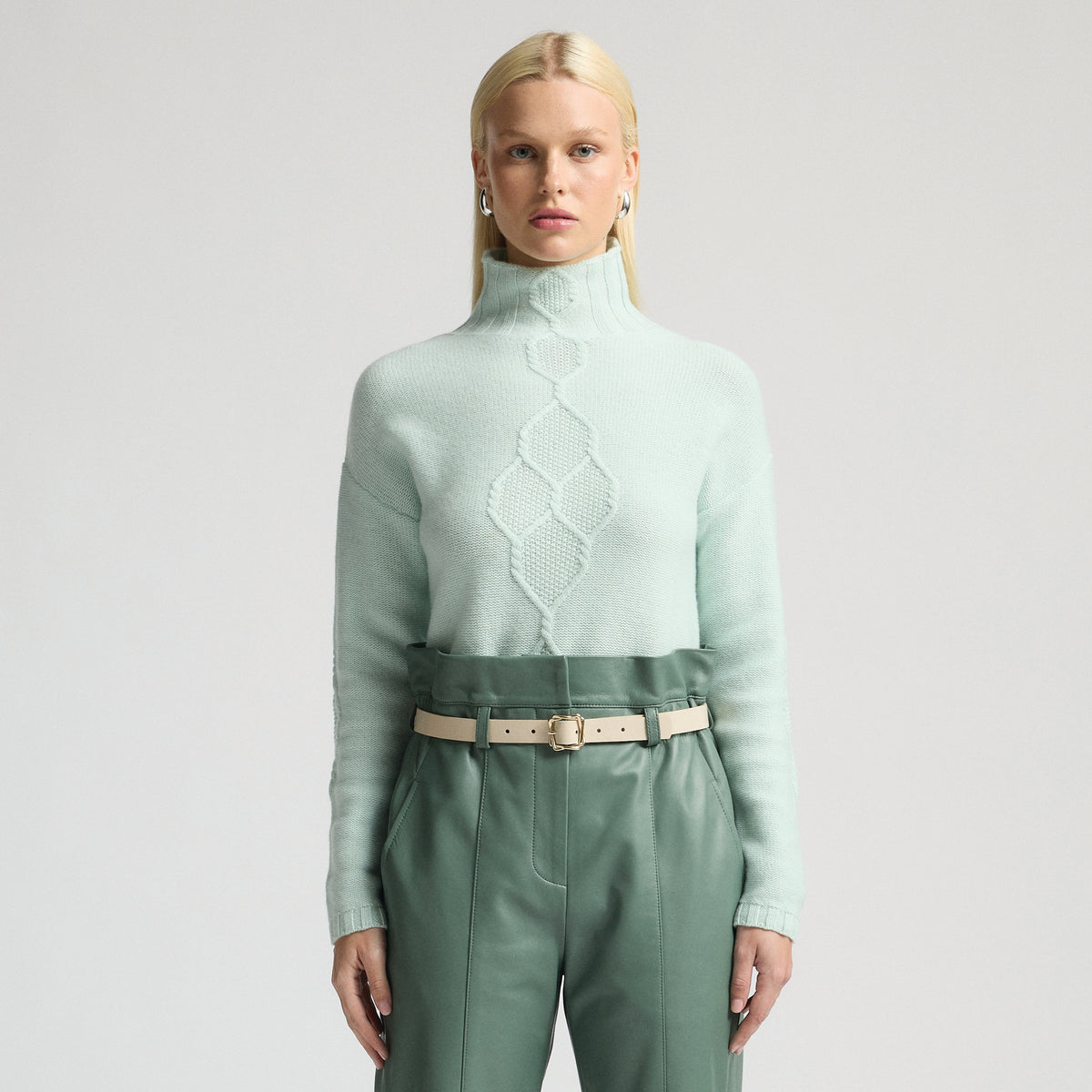 Rhea is a stunningly cut ethically sourced Cashmere blend funnel neck knit, perfectly luxurious and cosy for those chilly days. In a slightly more robust knit texture the Rhea has an elegant “chain” knit texture along the centre front from the collar to the bottom hem, and the same chain texture detail going through the sleeve. Wide rib detail along the hem and collar, with a beautifully cut hem line that sits comfortably around the bottom of the wearer with a perfectly positioned side gusset for comfort and allowing for layering. The back is slightly scooped for extra warmth and the whole garment just oozes luxury and sophistication.